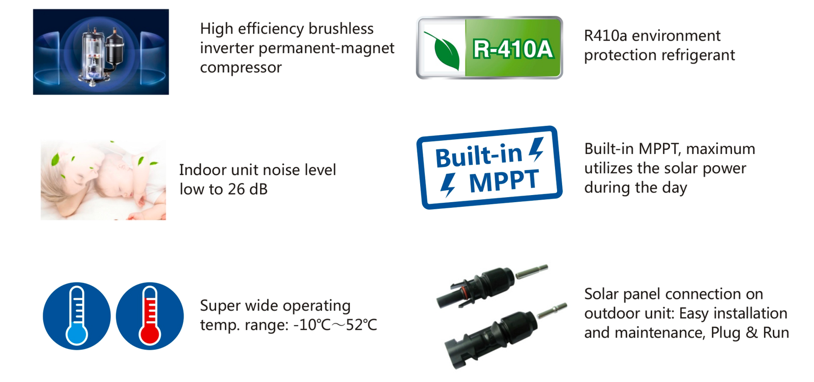 - Sunshine is perfect: When solar meets the minimum running requirement of the compressor, the a/c unit can start and operate by solar energy only, even if the grid is off,100% energy saving (100% solar)
